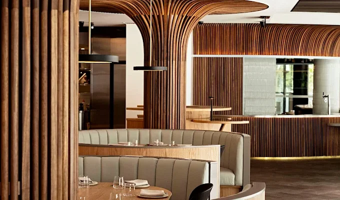 Curved timber columns inspired by Harry Seidler’s “mushroom” building, taupe leather booths, neutral tones, warm lighting! Space seamlessly integrates with iconic MLC architecture. Outdoor terrace overlooking Martin Place’s sculptural pool!