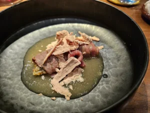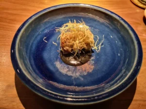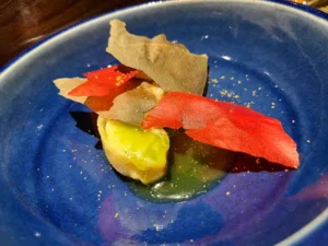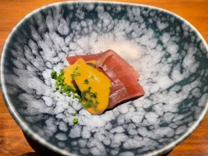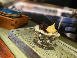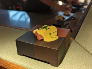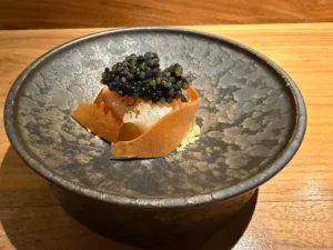 The restaurant resembles the kind of high-end omakase diners you’d encounter in Tokyo. An American walnut counter dominates the intimate space, with 12 settings illuminated by hanging spotlights that cast dramatic light on each bite-sized course. Dishes are presented on bespoke limestone plates hewn from a single stone from the Hunter Valley, adding to the theatrical presentation.